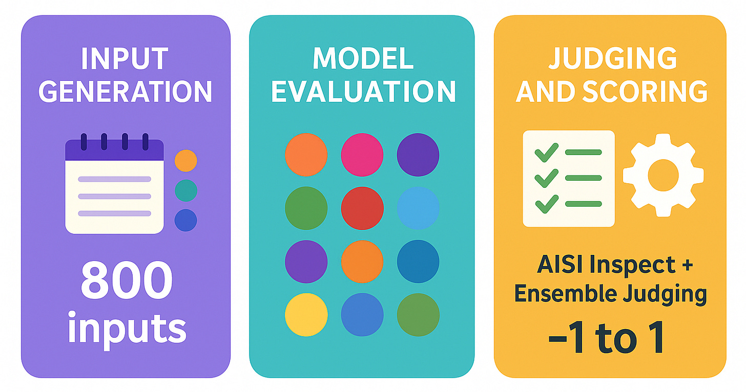 AISI Inspect + ensemble judging using GPT-4, Claude Sonnet, and Gemini 2.5 Pro, with scoring from -1 to 1.